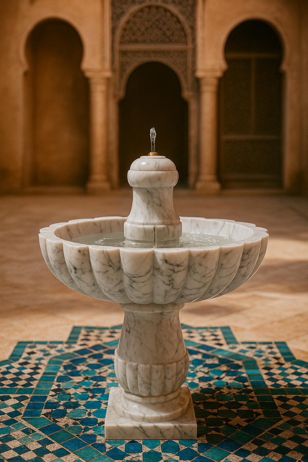 Chaque fontaine de cette série est le fruit d’un savoir-faire ancestral, sculptée entièrement à la main dans un marbre naturel de haute qualité (blanc veiné ou beige calcaire). Que vous choisissiez la finition ornée de calligraphie islamique sculptée (pour un look historique) ou le bassin cannelé et épuré (pour un luxe classique), vous investissez dans un héritage.