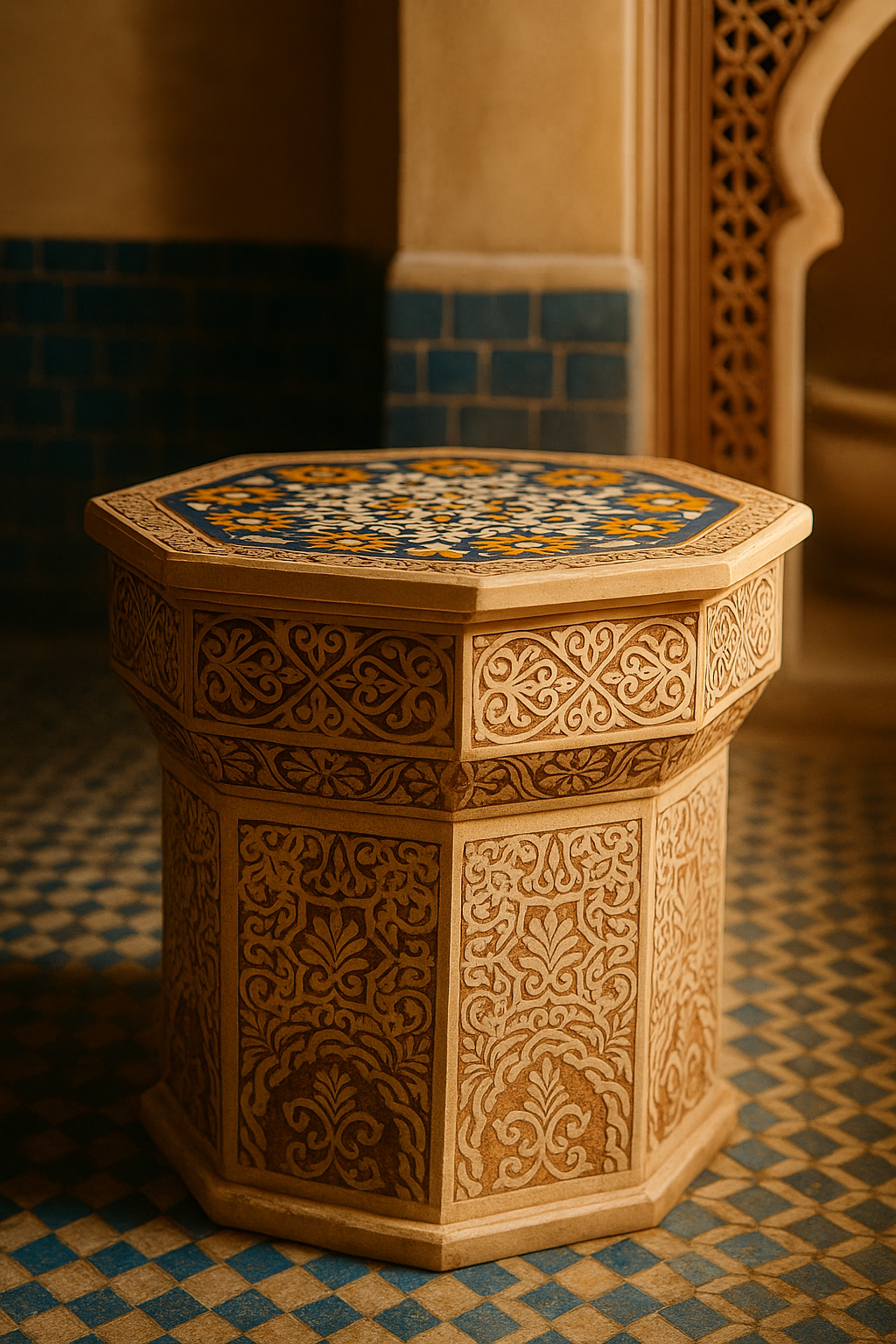 La structure hexagonale est entièrement sculptée à la main dans une pierre naturelle aux tons chauds. Les six faces sont ornées de motifs floraux et géométriques en arabesque, créant un relief texturé et fascinant. Le plateau, pièce maîtresse, est revêtu d’un Zellige vibrant, un travail de mosaïque de céramique émaillée, taillé et assemblé pièce par pièce selon des méthodes ancestrales.