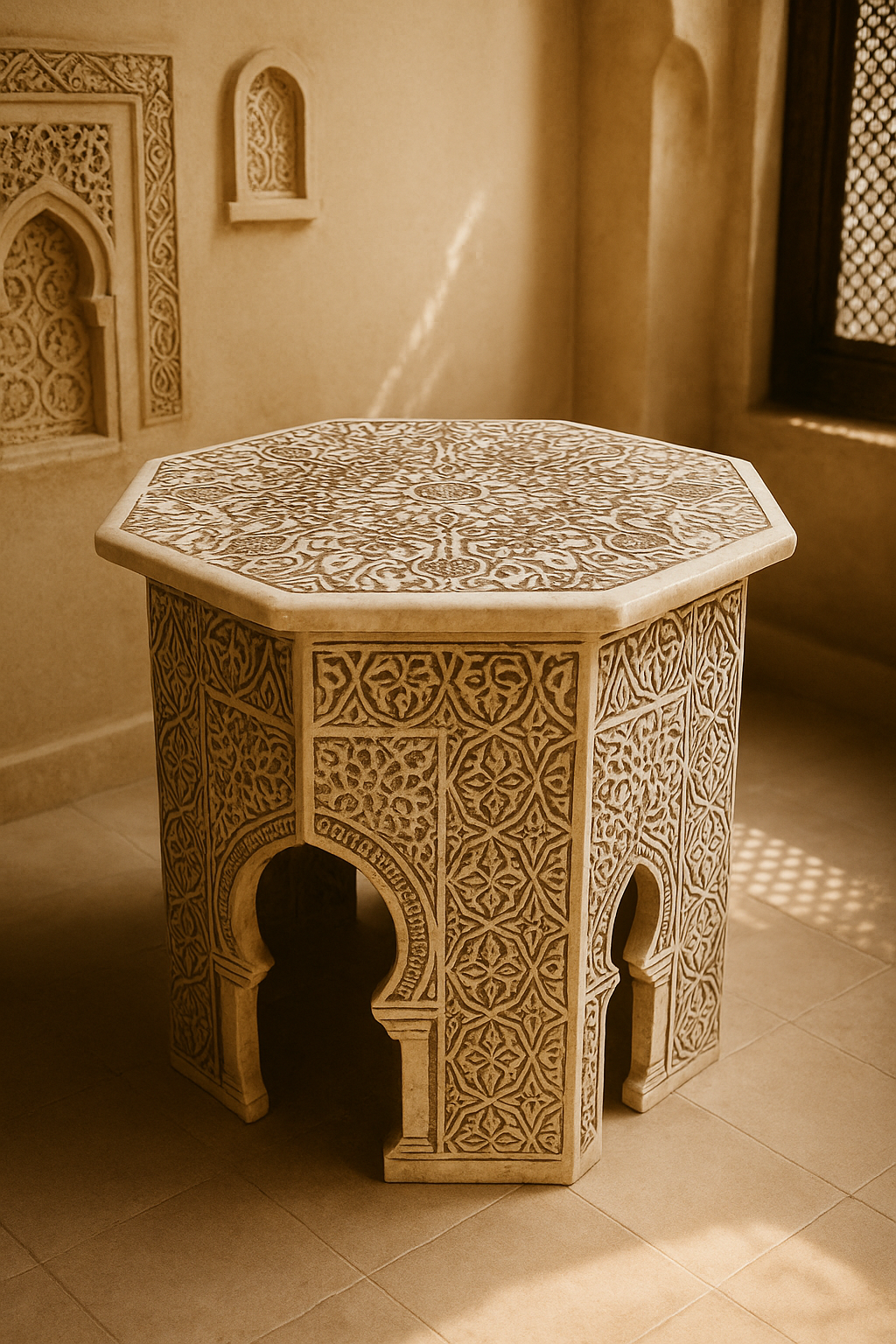 Chaque centimètre carré de ce guéridon hexagonal est une célébration de la gravure sur pierre. Sculpté dans un marbre de haute qualité aux tons chauds, le corps de la table est orné d’un répertoire infini de motifs géométriques et floraux en arabesque, créant un relief d’une profondeur et d’une complexité hypnotisantes. Les ouvertures en arc de cercle, délicatement travaillées, rappellent l’architecture des moucharabiehs et des portes des médinas.