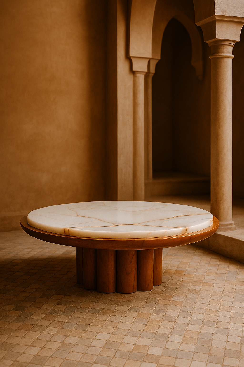 Le plateau, d’un diamètre généreux de 80*40 CM, est taillé dans un onyx d’une blancheur éclatante ou un marbre veiné d’une clarté lumineuse, dont les motifs organiques semblent danser sous la lumière. La pierre est enchâssée sur une base en bois massif précieux, sculptée avec une série de cannelures (ou demi-cylindres) qui créent un jeu d’ombre et de lumière sophistiqué. La chaleur du bois contraste magnifiquement avec la froideur et la translucidité de la pierre.