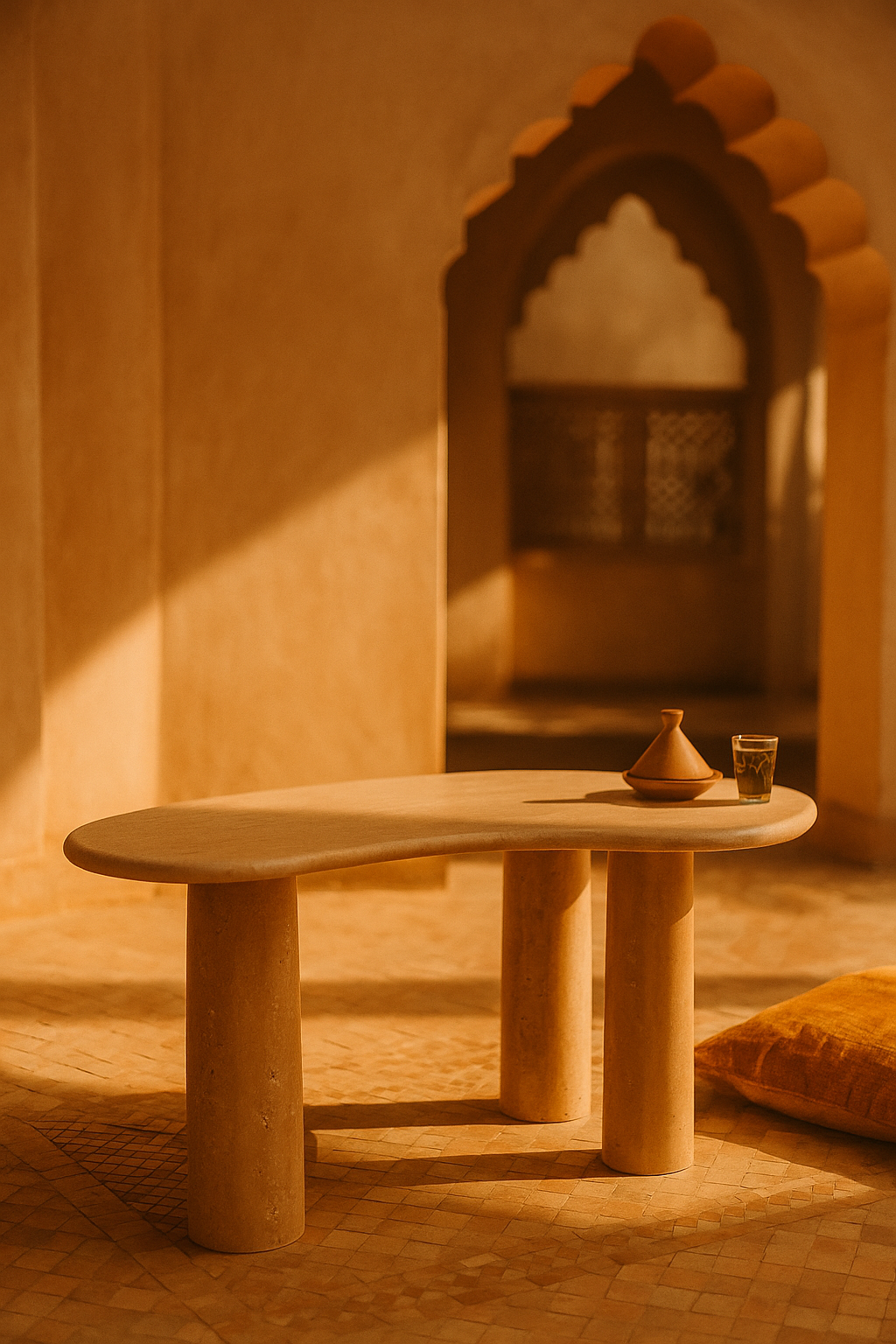 Taillée dans le Travertin massif, cette table présente un plateau à la forme libre et asymétrique qui rappelle la douceur d’une dune ou d’un galet poli par le temps. La chaleur naturelle et les nuances beiges du Travertin confèrent une atmosphère de sérénité et d’authenticité, parfaitement en phase le luxe des Riads minimalistes.