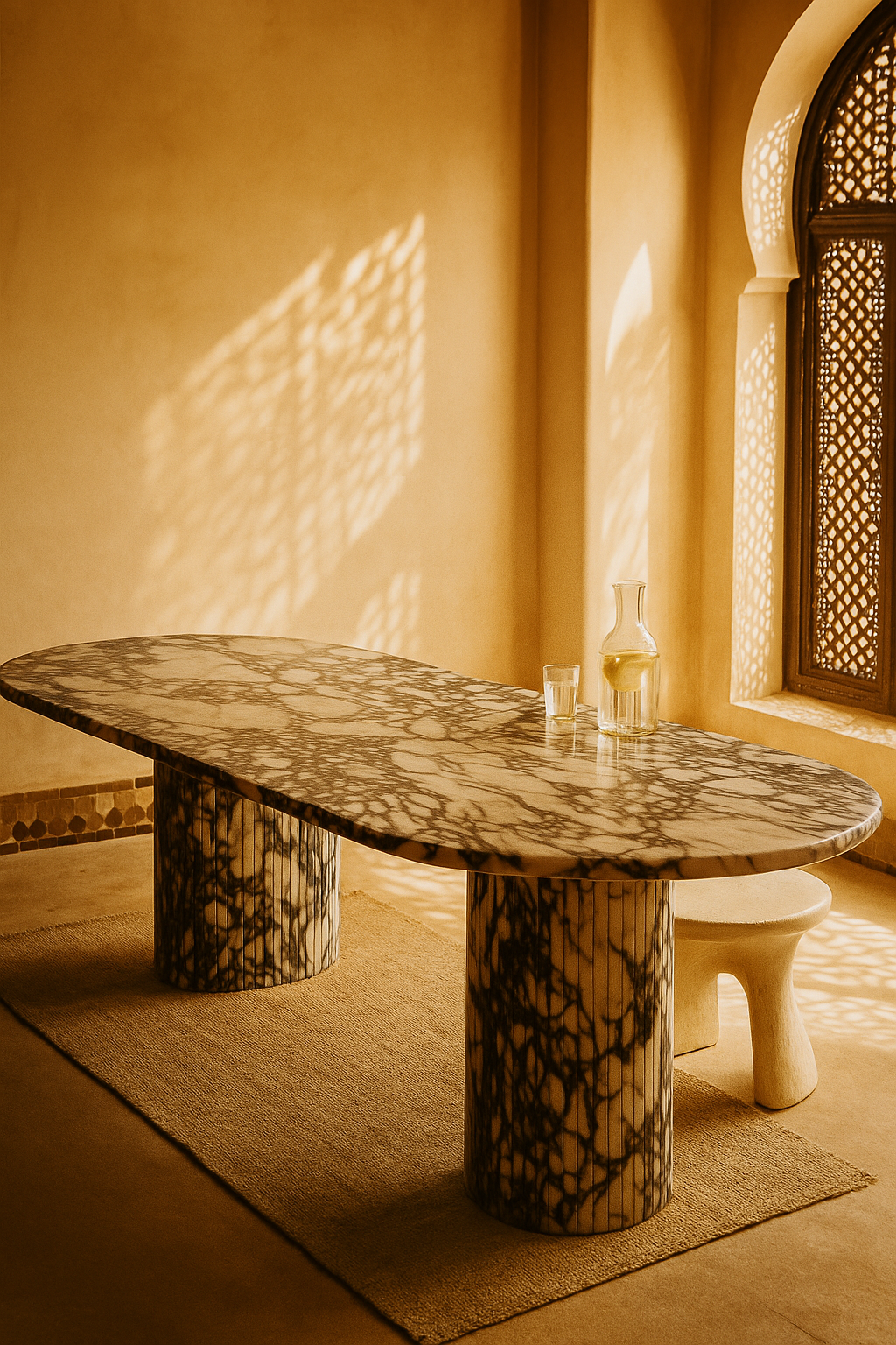 Le plateau ovale massif, avec ses veines sombres spectaculaires sur fond clair (évoquant le Marbre Arabescato ou Carrare veiné), crée un contraste saisissant, transformant chaque repas en un événement. Il repose sur deux pieds cylindriques robustes, dont la texture cannelée (striée) ajoute un dynamisme et une profondeur visuelle uniques.
