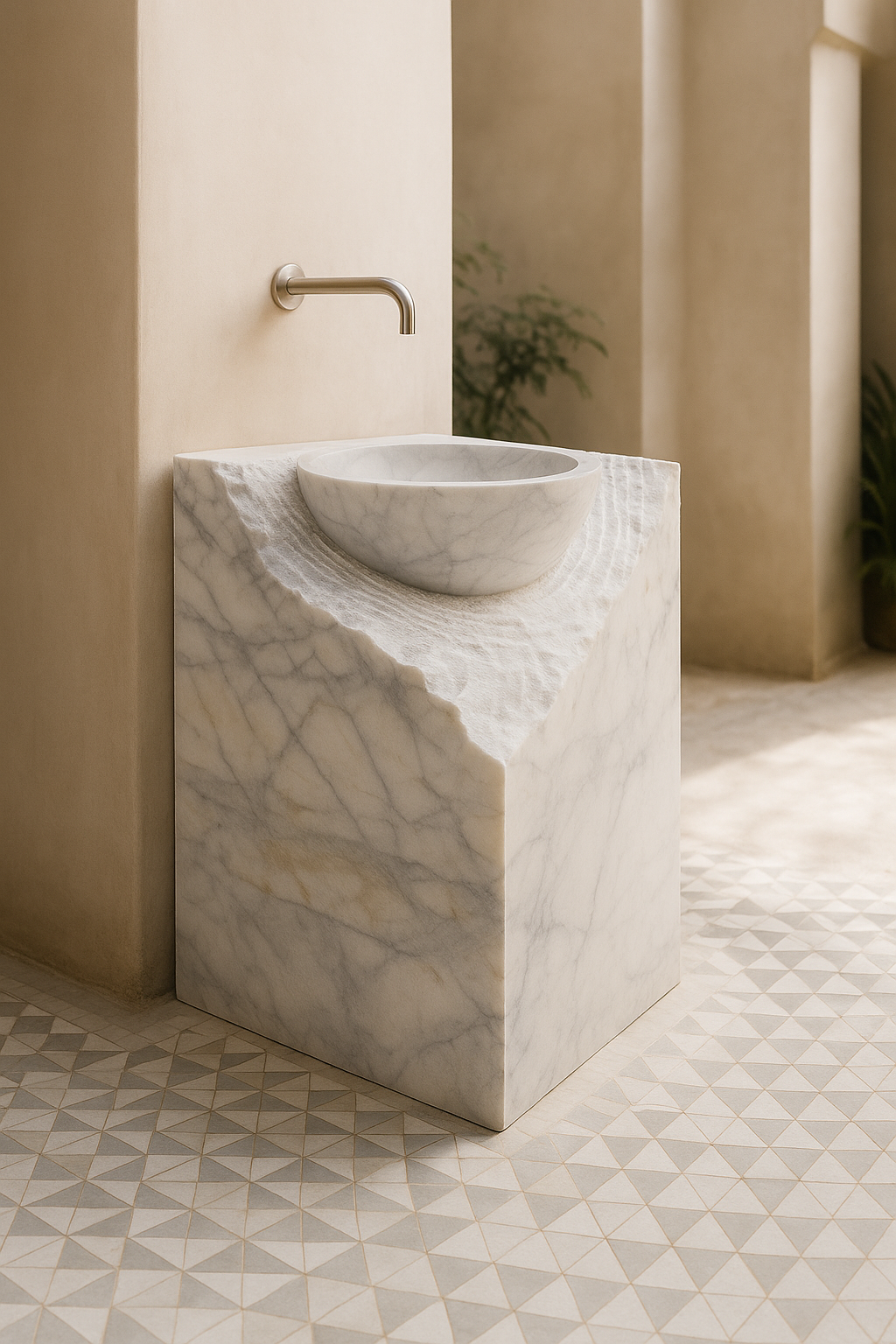 Alliez force brute et élégance raffinée avec la Vasque Monumentale, sculptée dans un bloc de marbre blanc naturel. Ses dimensions de 40*40*85 CM et son design audacieux en font une pièce sculpturale, idéale pour les salles de bain d’exception, les riads contemporains, les hôtels de prestige ou les villas haut de gamme.