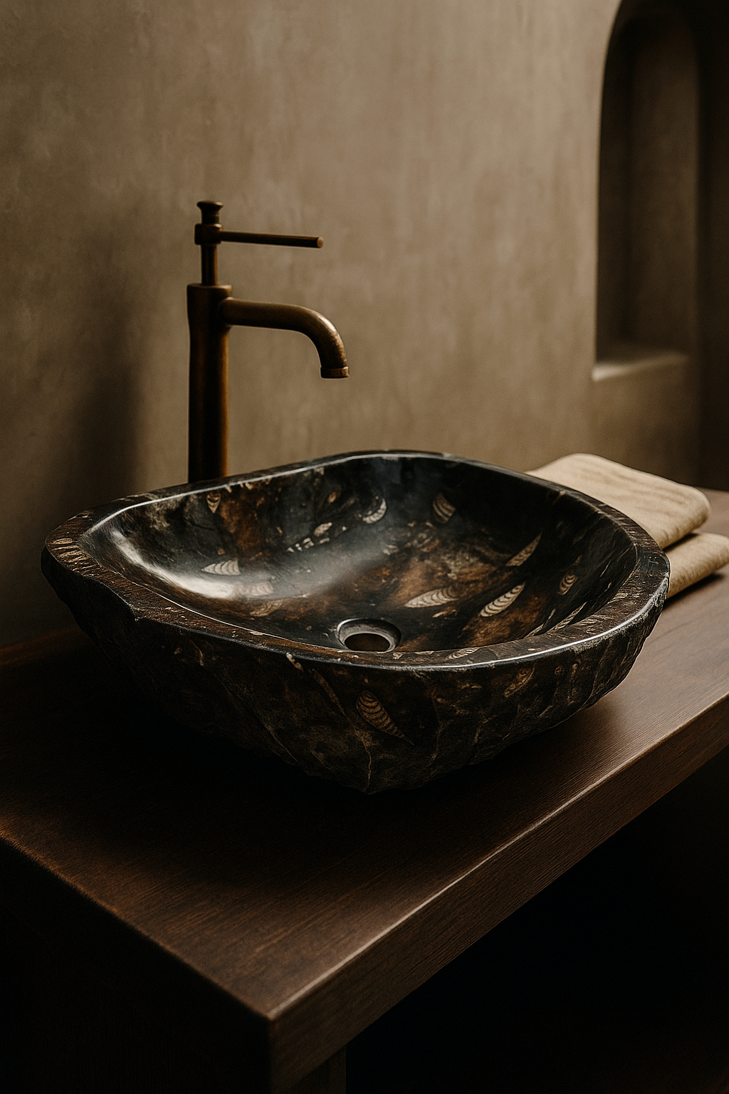 Apportez un caractère unique à votre salle de bain avec la Vasque Fossilisée Prestige, une œuvre d’art taillée dans du marbre naturel incrusté de fossiles authentiques.  elle incarne l’harmonie parfaite entre design brut, histoire millénaire et élégance contemporaine.