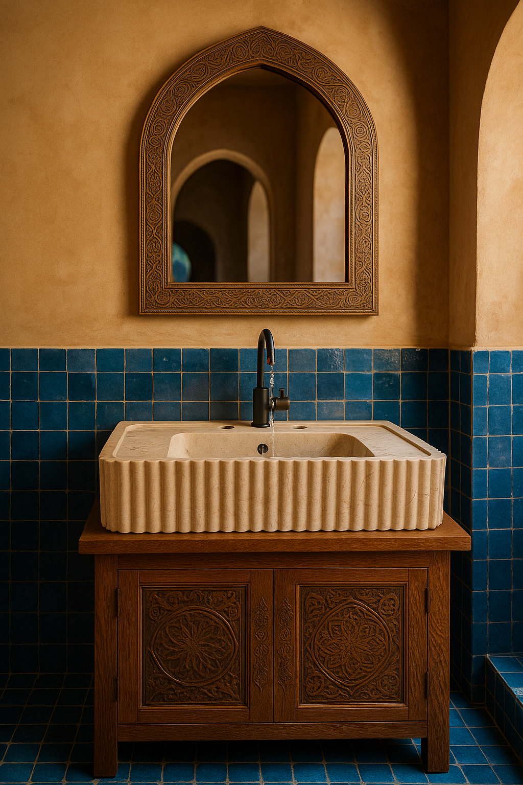 Elle s’intègre parfaitement dans un environnement d’inspiration riad contemporain, créant un contraste dramatique et sophistiqué avec les murs en tadelakt ocre et les sols en zellige aux motifs géométriques (comme illustré). Associée à une robinetterie noire mate, elle garantit un look monochrome et épuré. C’est le choix des architectes et des designers pour les projets de rénovation de prestige et les résidences les plus luxueuses.