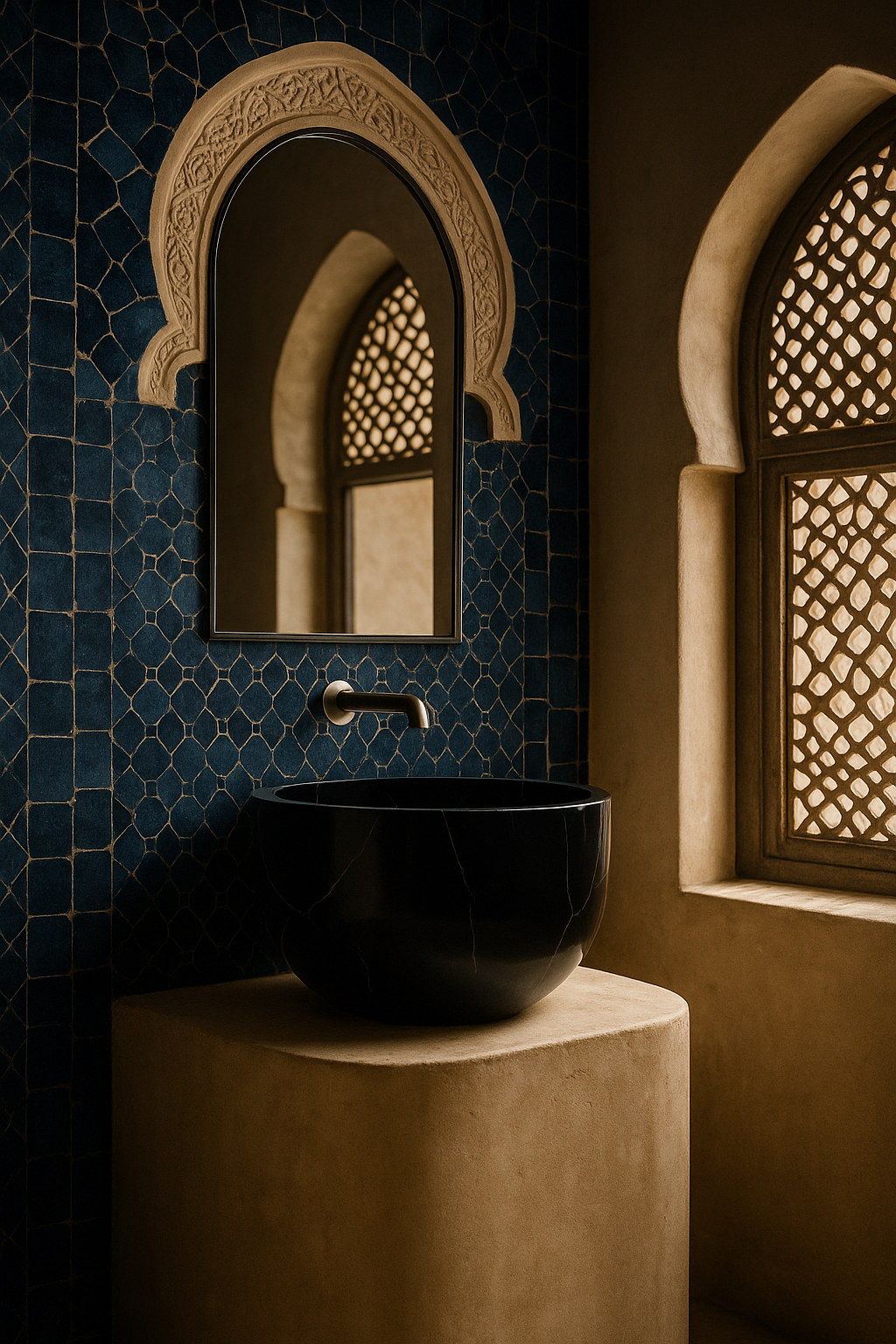 Avec sa texture martelée et son aspect minéral authentique, elle transforme chaque salle de bain en un espace raffiné et chaleureux d’inspiration Riad. Son design allie force, authenticité et sophistication, faisant d’elle un choix idéal pour les amoureux du naturel et du luxe discret. Elle crée un contraste saisissant avec les zelliges modernes ou les murs en tadelakt traditionnels.