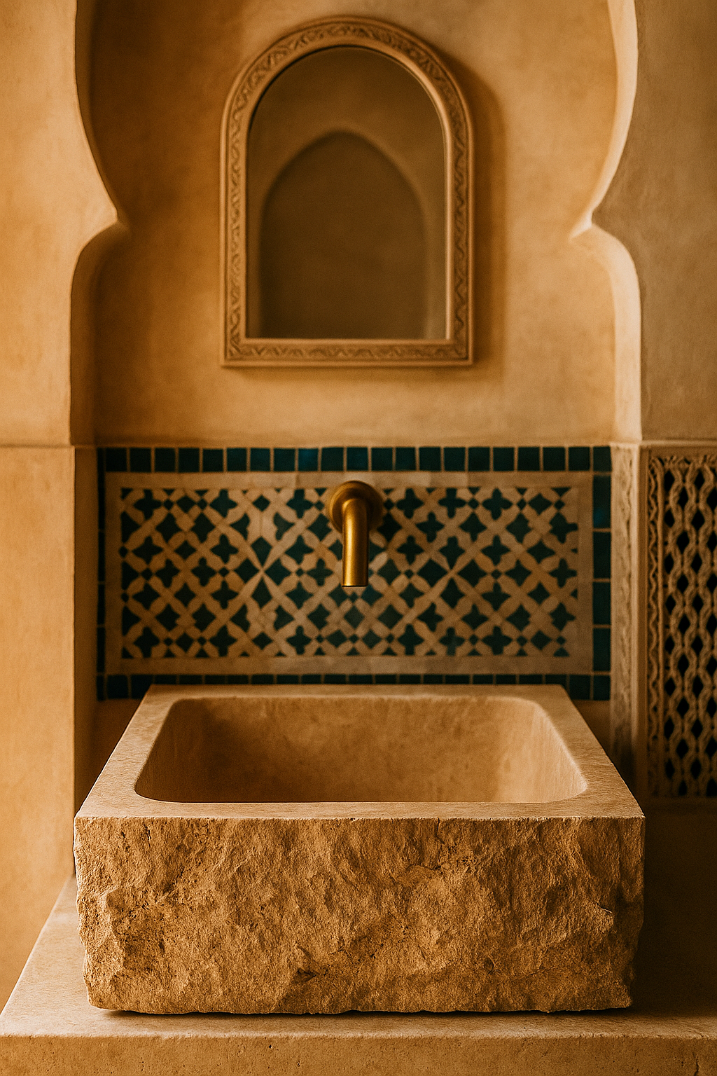 Disponible en finition lisse et polie pour un look contemporain (comme la première image) ou en finition brute et martelée pour une esthétique rustique-chic (comme la deuxième image), cette pièce à poser s’adapte à votre vision. Son format rectangulaire moderne contraste magnifiquement avec les zelliges géométriques et les arches des riads, créant un espace à la fois ancré dans la tradition et résolument actuel.